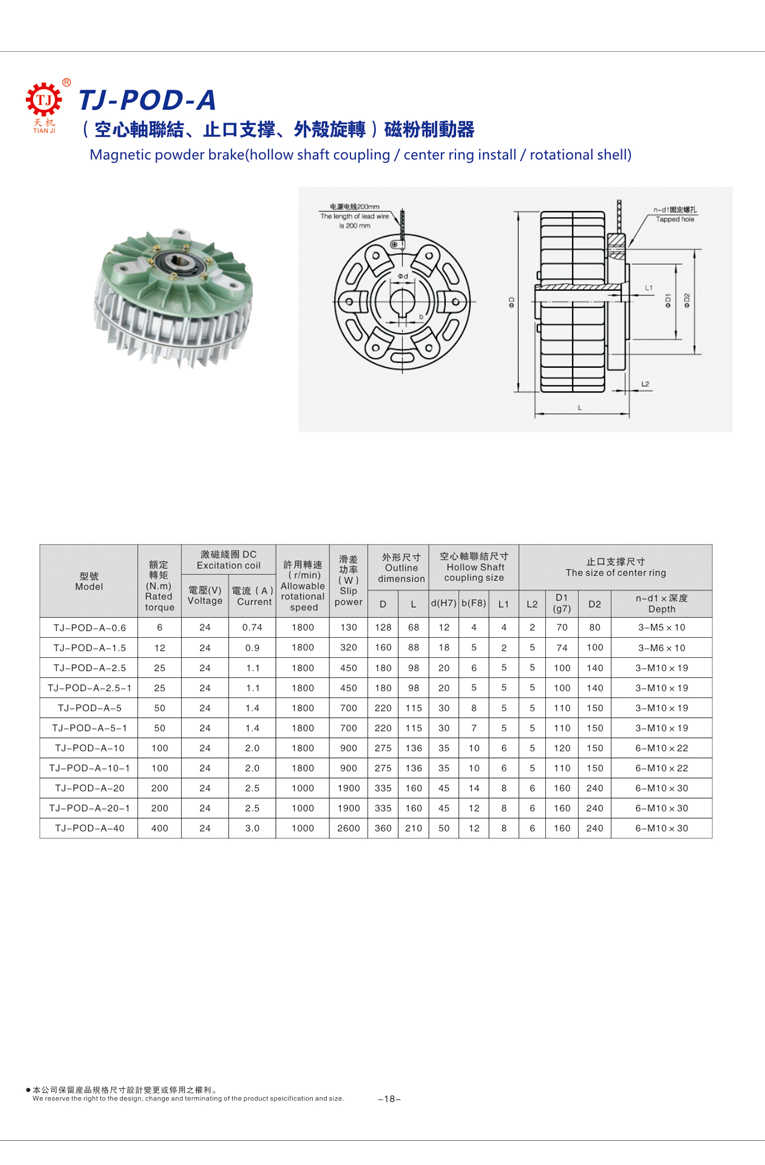 東莞天機(jī)傳動(dòng)生產(chǎn)廠家制造的中空軸磁粉剎車器又稱外殼旋轉(zhuǎn)磁粉剎車器;中空軸磁粉剎車器熱容量很大:由于使用了耐熱性優(yōu)的磁粉及運(yùn)用了理想的冷卻方法。即使是過于嚴(yán)酷的連續(xù)滑動(dòng)運(yùn)轉(zhuǎn),采用的是DC24V直流安全電壓,也可以安心使用。外殼旋轉(zhuǎn)磁粉剎車器型號(hào)有:TJ-POD-A-0.6、TJ-POD-A-1.5、TJ-POD-A-2.5、TJ-POD-A-5、TJ-POD-A-10、TJ-POD-A-20、TJ-POD-A-40等更大的磁粉剎車器;
