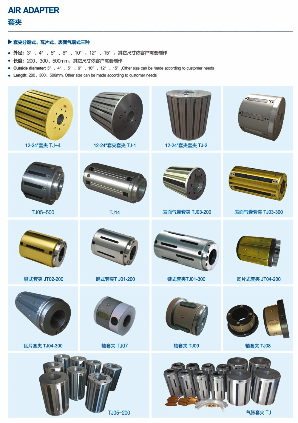 鋁合金板條式氣脹套夾,鋼制瓦片式氣脹套夾適用于涂布、分切、印刷、復卷、復合、造紙、塑料等相關機械的收放卷軸,適用于其它機械設備的有:涂布機、皮革機、定型機、壓花機、分條機、模切機、復卷機、復卷機、紙筒機、貼合機、覆膜機、吹膜機、發(fā)泡機、淋膜機、壓紋機、造紙機、無紡布機、驗布機、燙金機、電池設備等相關機械配套之使用。